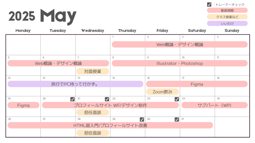 担任からは動画はHTMLまでを2ヶ月間で見るのを一つの目標に!と言われ、動画鑑賞に全集中をしました。