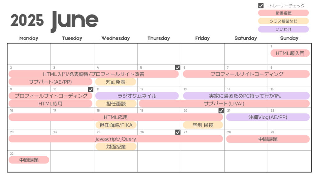 他のママさんと話した感じ、入学して2ヶ月が終わるこの時点でプロフィールサイトのコーディングが終わってる人がちらほら出てきた印象です。動画は応用編を見始めていないと「ちょっと急いだ方がいいかも」、と担任からアドバイスがあったようです。