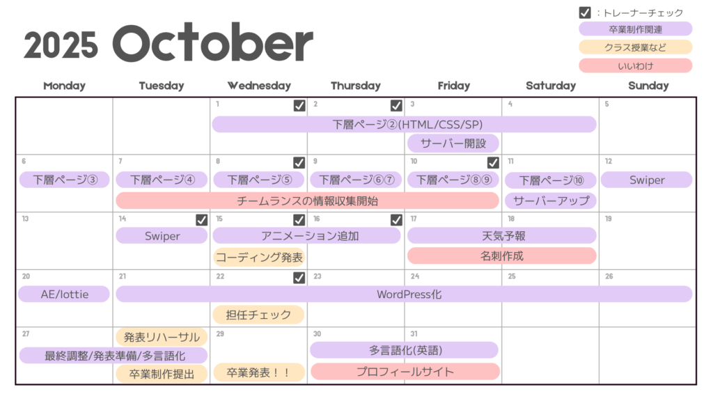 コーディング発表でもらったフィードバックを次の日にはやっつけて、「卒業制作までにできたらいいな!」部分に着手を始めました。